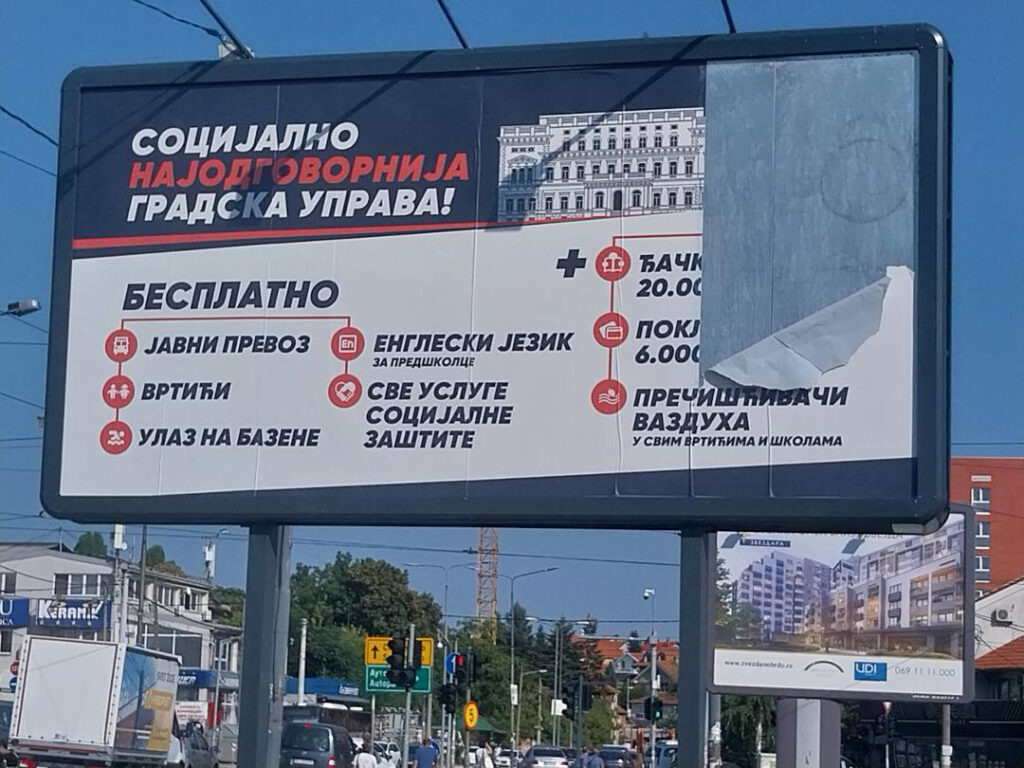 E, sad malo Beograd. Već mesecima na više od polovine bilborda stoji puvakanje o “socijalno najodgovornijoj gradskoj upravi”, pa se onda navodi besplatan prevoz, besplatni vrtići, besplatna socijalna pomoć, đačka pomoć od 20.000 dinara, besplatan engleski za predškolce…