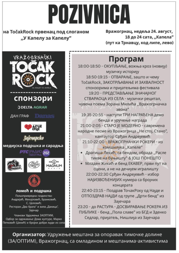 Nepunih 24 časa kasnije (nedelja, 24. avgust), od 18.00 pa “do rastura”, počeće Vražogrnački “Točak. Rok” festival, koji je moj dragi kolega i prijatelj Božidar Andrejić duhovito najavio kao “prvo, a već okruglo”…