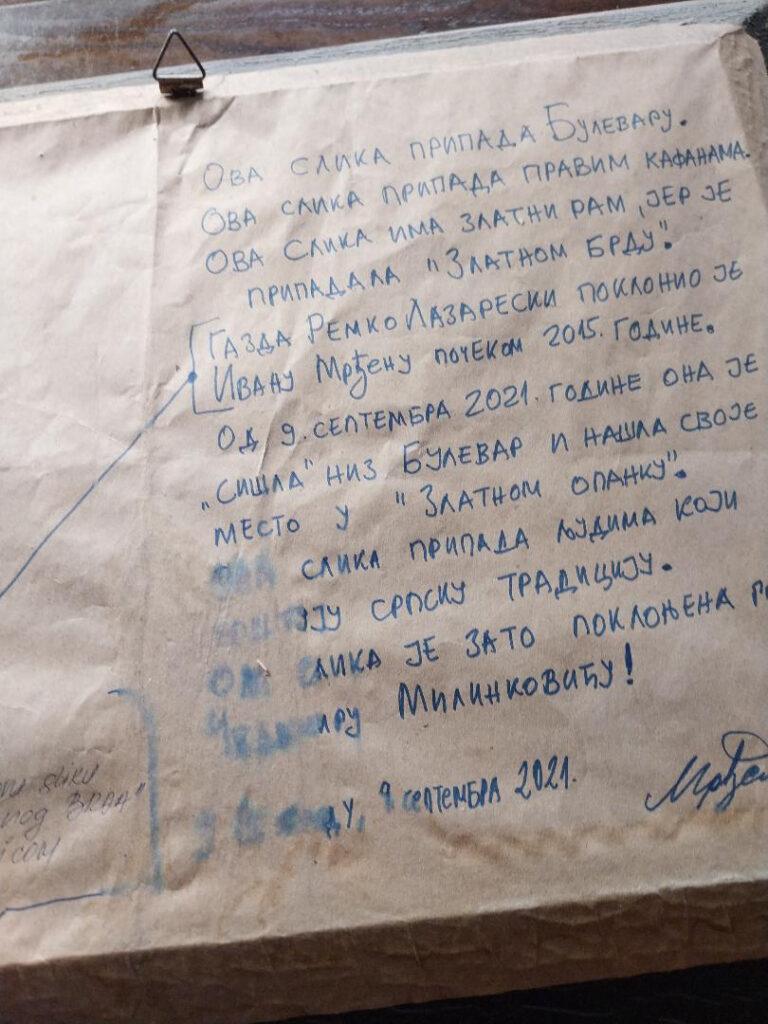 Zato sam na poleđini one Remkove slike napisao i potpisao: „Ova slika pripada Bulevaru. Ova slika pripada pravim kafanama. Ova slika ima zlatni ram, jer je pripadala ’Zlatnom brdu’. Gazda Remko Lazarerski poklonio je Ivanu Mrđenu početkom 2015. godine. Od 9. seprembra 2021. ova slika je ’sišla“ niz Bulevar i našla svoje mesto u ’Zlatnom opanku’. Ova slika pripada ljudima koji neguju srpsku tradiciju i zato je poklonjena Čedomiru Milinkoviću.“