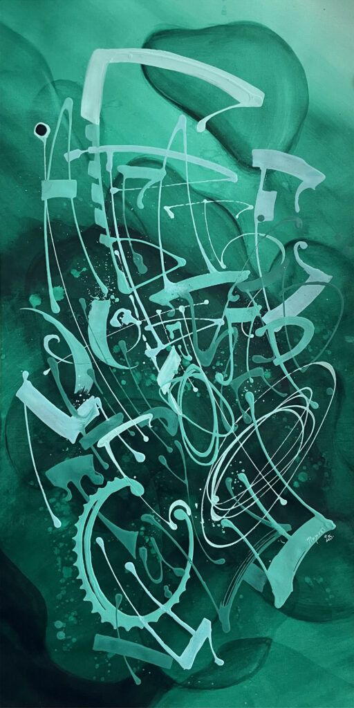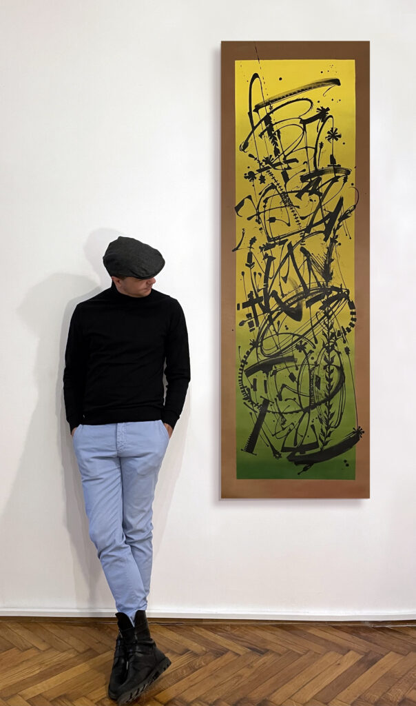 – Moja ideja je bila da ove elemente povežem sa kulturom prostora iz kog dolazim. Ćirilica mi se prirodno nametnula kao najlogičniji kanal – ona nas povezuje, ima duboku istorijsku i simboličku osnovu, i ogroman vizuelni potencijal. U radove integrišem oblike, svedene (mirnije, sa dubljim zvukom) boje, poteze, tehnike i simbole ne samo našeg pisma, već i drugih znakova i pisama, stvarajući hibridnu, univerzalnu strukturu u kojoj svako može prepoznati deo sopstvenog vizuelnog pamćenja – reči su Pirosa, koji je studije grafičkog dizajna završio u Beogradu.
