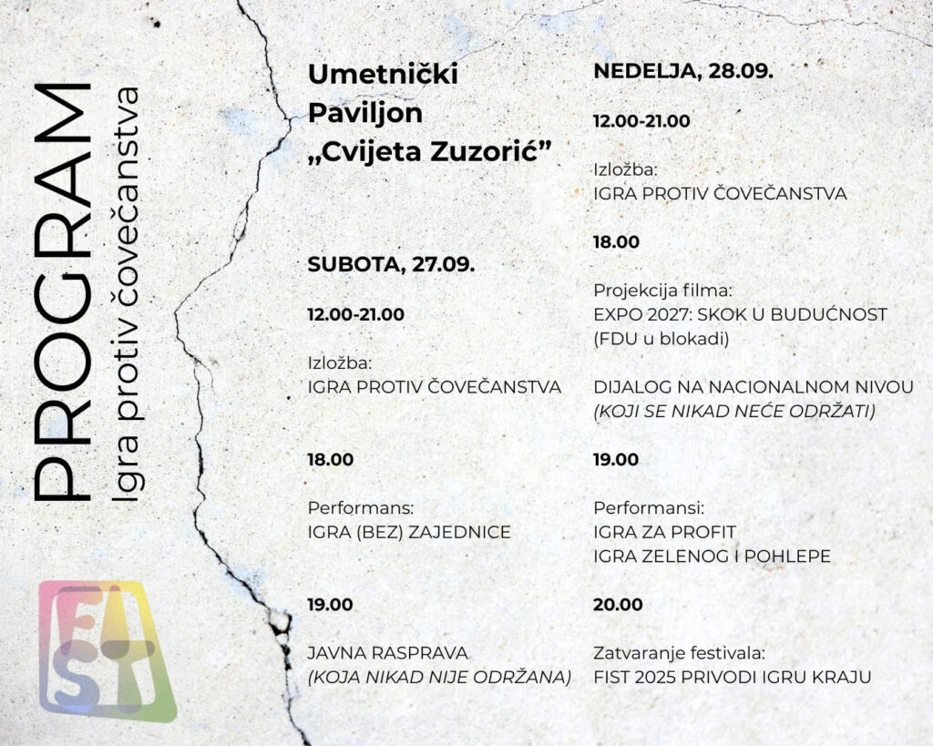 Predstojeći festival preuzima format EXPO 2027, ali ga pretvara u prostor debate i otpora. I dok EXPO ima slogan „Igra za čovečanstvo“, Fist je to pretvorio u „Igra protiv čovečanstva“. I 27. septembra u „Cvijeti Zuzorić“ biće održana javna rasprava o EXPO 2027 – koja nikada nije održana – a biće otvorena za građane, stručnjake i više puta pozvane zvanične predstavnike nadležnih institucija i EXPO tima. Svi će moći da postavljaju pitanja, komentarišu, dobiju odgovore i zajednički oblikuju dokument koji će biti poslat nadležnim telima kao stav građana.