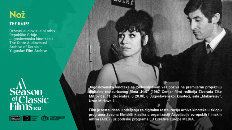 Jugoslovenska kinoteka je u okviru evropskog projekta Sezona filmskih klasika digitalno restaurisala krimi dramu „Nož“ (1967) reditelja i scenariste Živorada Žike Mitrovića, a nova kopija biće premijerno prikazana 11. decembra u 20 sati u sali „Makavejev“, a sat kasnije na Jutjub kanalu ove ustanove.