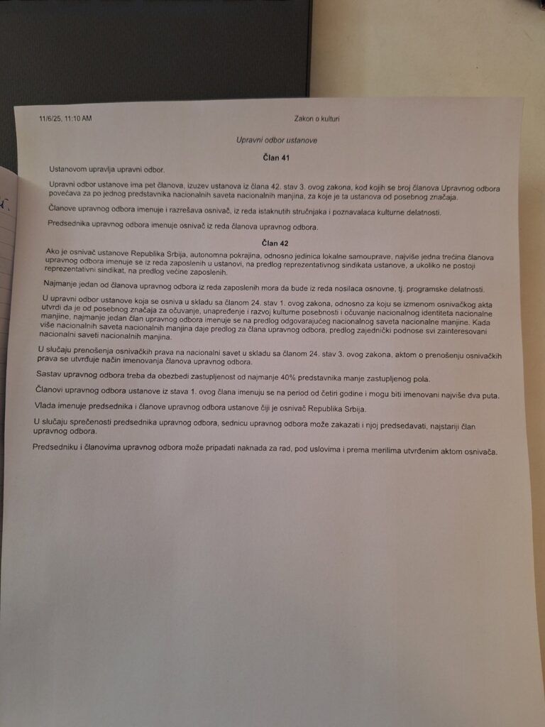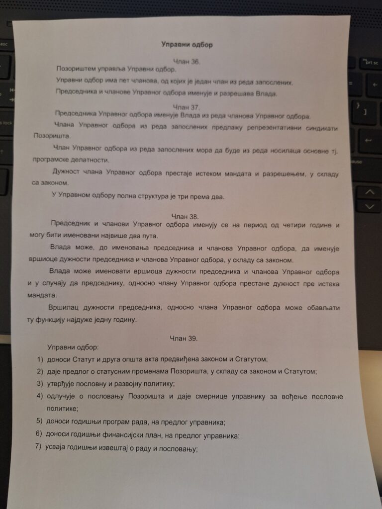Zakon o kulturi propisuje da jednom kulturnom ustanovom upravlja upravni odbor. Taj odbor, po ovom zakonu, ima pet članova, koje imenuje i razrešava osnivač, kao i predsednika UO. U slučaju Narodnog pozorišta to je Republika Srbija, odnosno Vlada Srbije, koja je u julu imenovala članove UO. Za predsednika postavila je reditelaj Dragoslava Bokana, a za članove – glumca Milenka Pavlova, kompozitora Miroljuba Aranđelovića Rasinskog, direktorku Baletske škole „Lujo Davičo“ Ivu Bojović Petković i članicu Hora Opere Narodnog pozorišta Natašu Madžarević Mijailović. Obe članice, postavljene letos, više nisu u UO koji trenutno ima samo tri člana, od kojih nijedan nije iz reda zaposlenih.