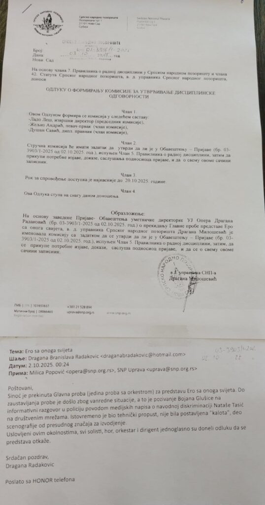 – Nakon obaveštenja o formiranju komisije za disciplinsku istragu o povredi Pravilnika o radu koji je oformila v.d. upravnika Srpskog narodnog pozorišta Dragana Milošević, a u komisiju postavila pevača Željka Andrića, bliskog SNS-u, Dragana Radaković je želela da zašti svoje kolege iz orkestra i hora i suprotstavila se dopisom upravnici – kaže za Nova.rs dobro obavešten izvor iz SNP-a.