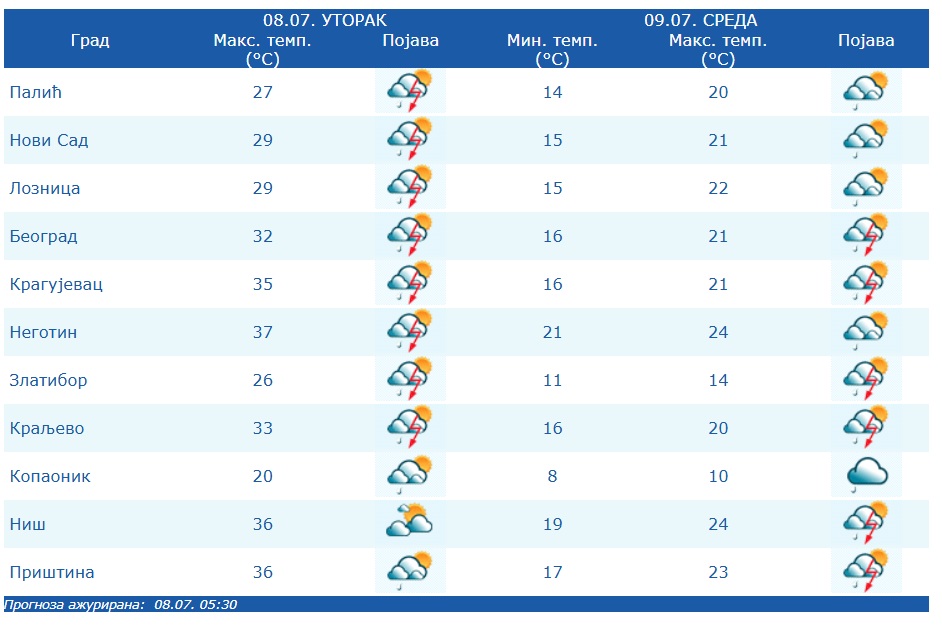 Danas se očekuju dva prodora vlažnog i nestabilnog vazduha. Prvi prodor, koji će ujutro i pre podne zahvatiti severozapad Vojvodine, od sredine dana pljuskove i grmljavinu usloviće širom pokrajine, kao i u zapadnoj i centralnoj Srbiji sa tendencijom premeštanja na istok. Pljuskovi će mestimično biti izraženiji uz grad, a umeren i jak južni i jugozapadni vetar tokom dana će biti u skretanju na severozapadni, dok se u oblasti jakih pljuskova očekuju i udari olujne jačine. Najviša temperatura od 26 °S na severozapadu Vojvodine do 39 °S na jugoistoku Srbije, navodi se u saopštenju RHMZ-a.