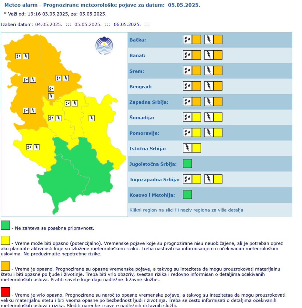 „Najnestabilnije vreme se očekuje u ponedelјak 5. maja posle podne i uveče na severu, zapadu i u delu centralne Srbije, a u utorak 6. maja u ostalim krajevima, kada su lokalno moguće obilnije padavine, kratkotrajna pojava grada i jak vetar u zoni najjačih plјuskova.“