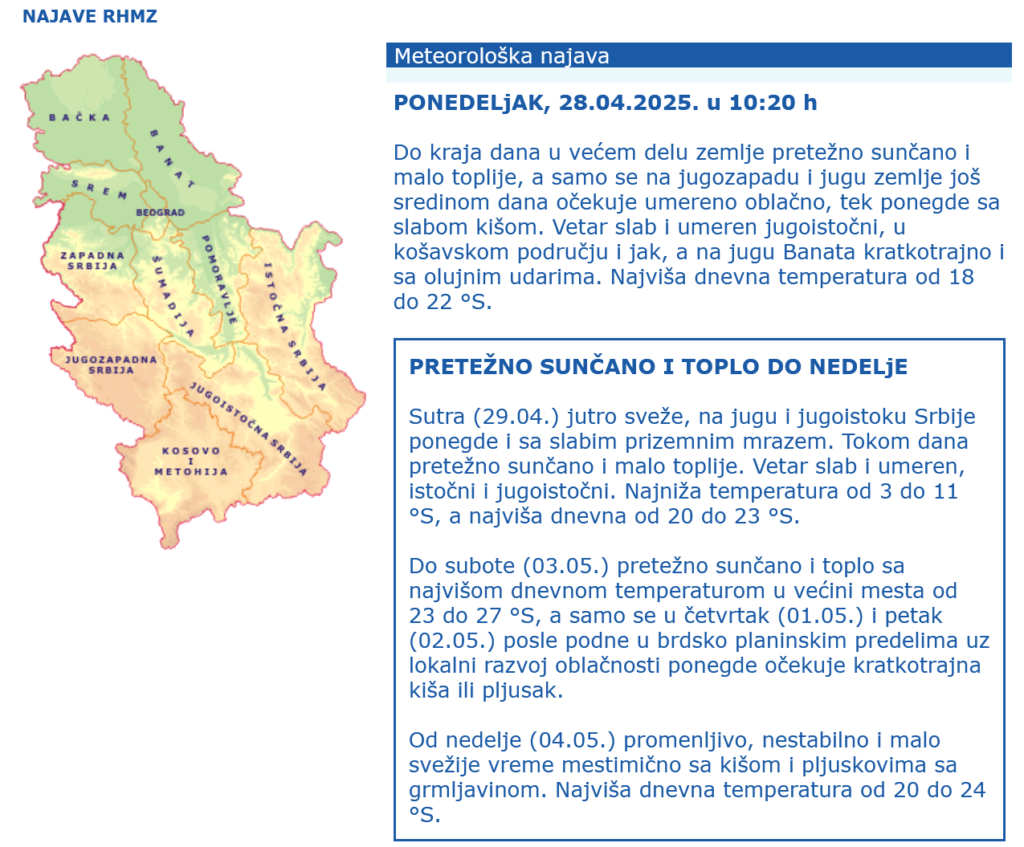 Sutra (29.04.) jutro sveže, na jugu i jugoistoku Srbije ponegde i sa slabim prizemnim mrazem. Tokom dana pretežno sunčano i malo toplije. Vetar slab i umeren, istočni i jugoistočni. Najniža temperatura od 3 do 11 °C, a najviša dnevna od 20 do 23 °C.