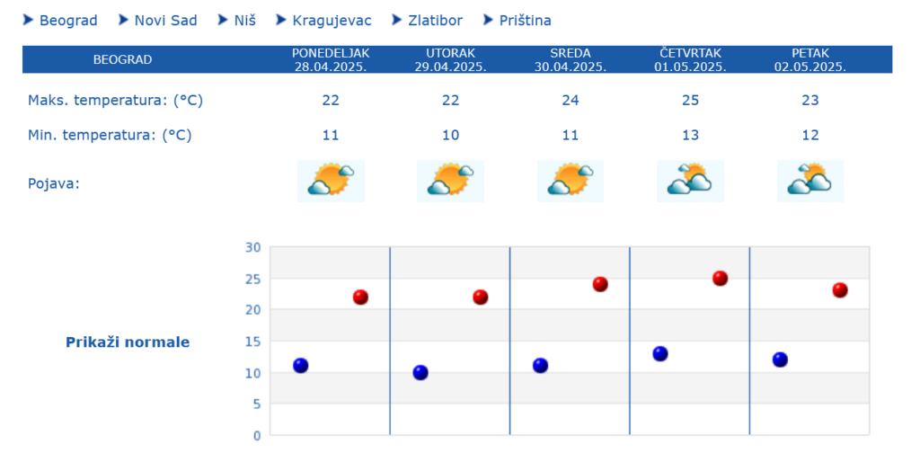 Narednih dana će biti pretežno sunčano i toplije sa temperaturama do 27 stepeni, a samo se u četvrtak (01.05.) i petak (02.05.) posle podne u brdsko planinskim predelima uz lokalni razvoj oblačnosti ponegde očekuje kratkotrajna kiša ili plјusak. Od nedelјe (04.05.) promenlјivo, nestabilno i malo svežije vreme mestimično sa kišom i plјuskovima sa grmlјavinom, s najvišim dnevnim temperaturama od 20 do 24 °C.