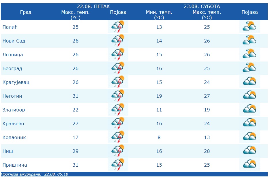 Za vikend (23 – 24.08.) prestanak padavina uz prijatnije temperature – smenjivaće se sunčani periodi i promenljiva oblačnost uz pojačan severozapadni vetar u Vojvodini, na istoku Srbije i u planinskim predelima. Maksimalne temperature od 23 do 26 °S, na krajnjem jugu i do 29 °S.