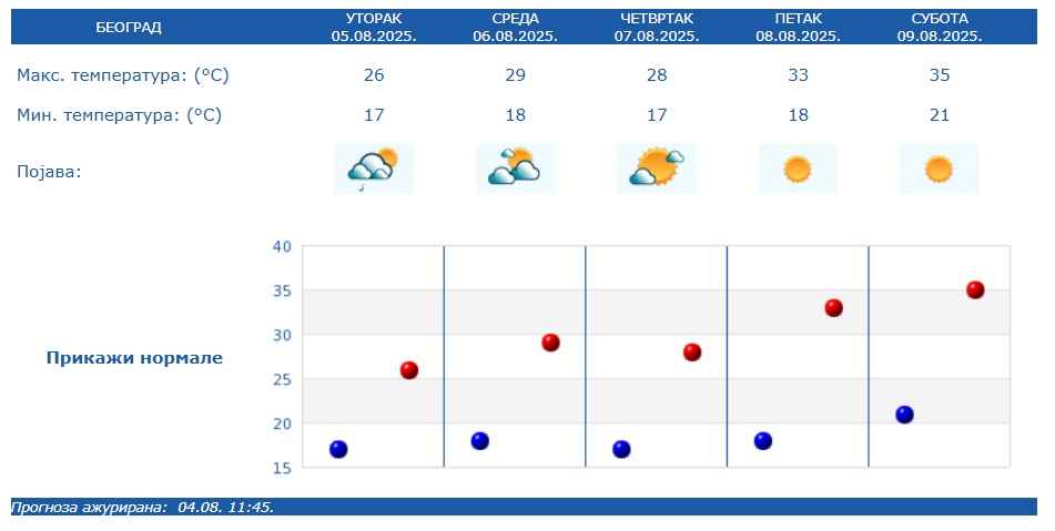 Visoke temperature do 35 stepeni zadržaće se do 20. avgusta i prema dugoročnoj prognozi očekuje nas period bez kiše sa višim temperaturama u toku dana i noćnim temperaturama koje će biti oko 21 stepen.