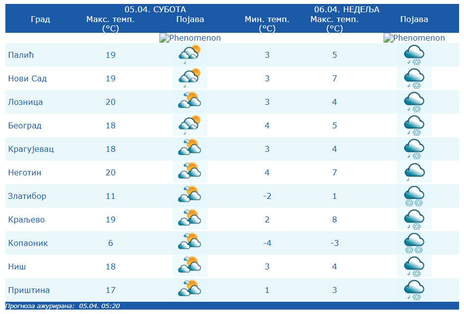 Tokom noći između subote i nedelje (5/6. april) i u nedelju (6. aprila) u planinskim predelima padaće sneg pa se očekuje i formiranje snežnog pokrivača visine do 10 cm, lokalno i više.