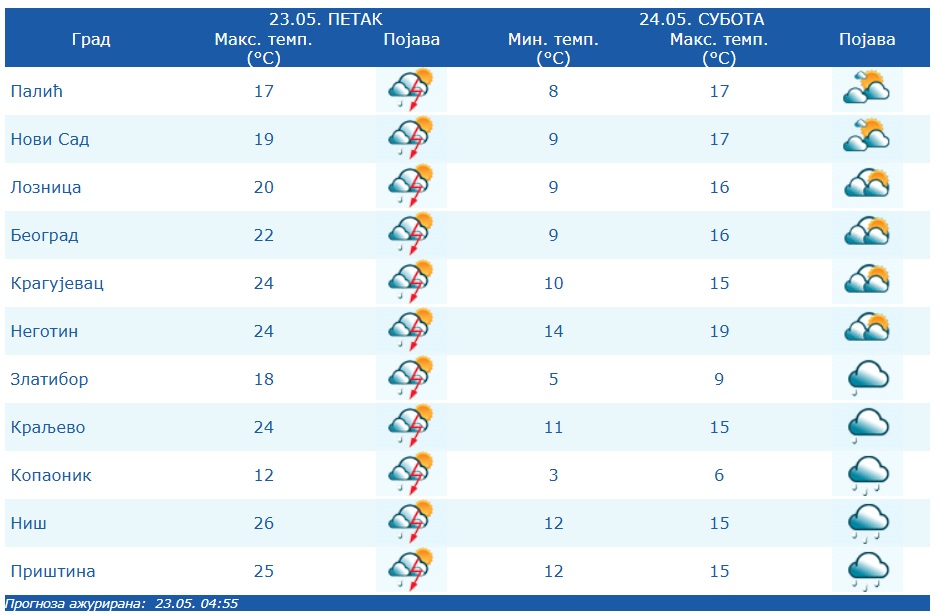 UPOZORENjE ZA PODRUČJE SRBIJE NA VREMENSKE NEPOGODE (za 23.05.2025.god.)