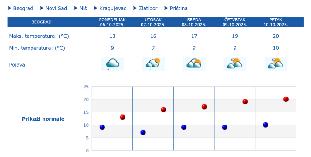 Danas umereno do potpuno oblačno i malo hladnije, na severu Srbije uglavnom suvo, u ostalim krajevima mestimično sa kišom, na visokim planinama južne Srbije pre podne sa slabim snegom. Vetar slab i umeren, ponegde kratkotrajno i jak, severozapadni. Najviša dnevna temperatura od 10 do 16 °C, najavio je RHMZ i dao prognozu i za naredne dane.