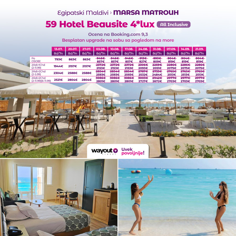 Novootvoreni Hotel 59 Beausite je smešten na prelepoj obali Marsa Matrouh, direktno na privatnoj plaži, sa prekrasnim pogledom na Sredozemno more. Nalazi se u samom centru Marsa Matrouh i udaljen je samo 15 minuta od očaravajućih atrakcija poput Cleopatra’s Bath, Romel Musuem, Ageeba Beach.