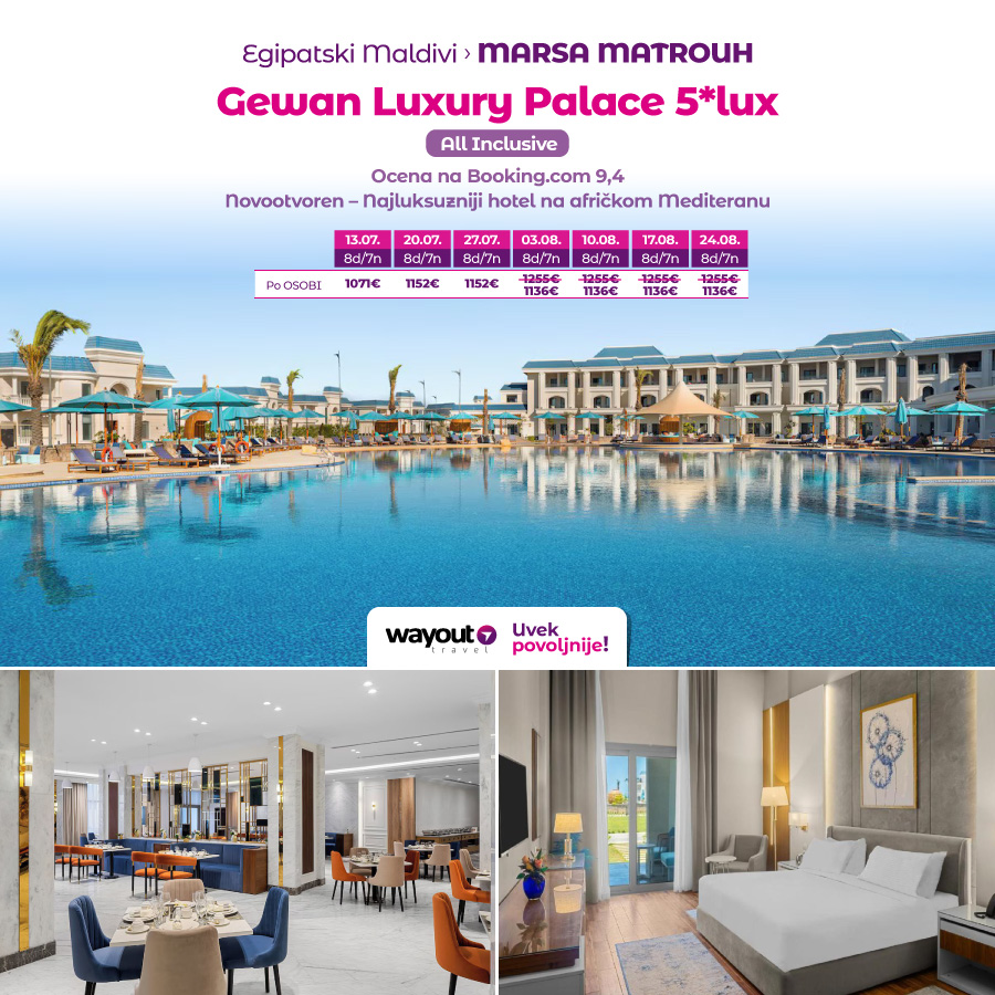 Gewan Luxury Palace je novootvoren hotel smešten u Novom Alameinu. Ovaj luksuzni hotel nudi privatnu plažu i direktan pristup obali. Gosti mogu uživati u zadivljujućem pogledu na more i bazenu na krovu. Dodatne pogodnosti uključuju fitnes centar, spa, saunu i terasu za sunčanje.