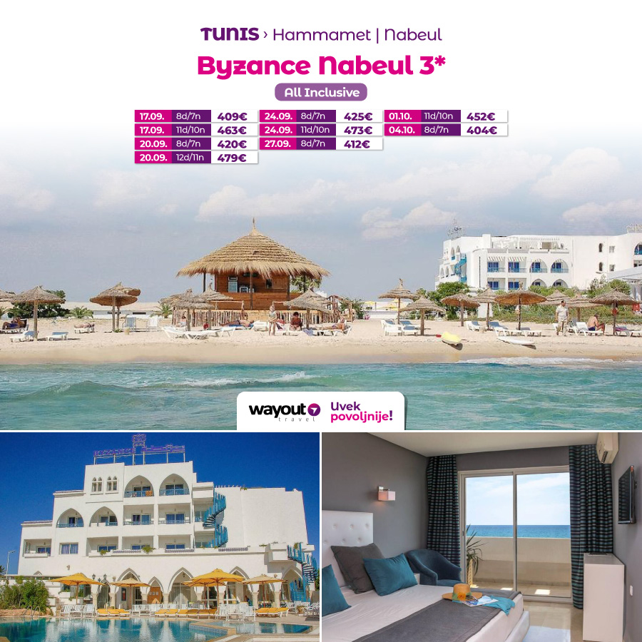 Hotel vas dočekuje u Nabeulu, glavnom gradu poluostrva Cap Bon. Ranije su ga zvali Neapolis, to je grad koji živi u ritmu talasa i sunca. Uživaćete na otvorenom bazenu, privatnoj plaži, teretani, solarijumu i fitnes centru sa đakuzijem, saunom, hamamom i masažom.