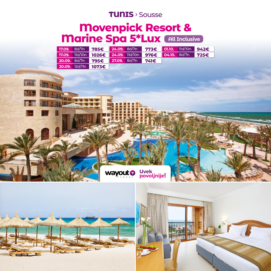 Hotel ima dva otvorena bazena, zatvoreni bazen sa morskom vodom koji radi za vreme zimskih meseci, fitness centar, odbojka na pesku, stoni tenis. Hotel Movenpick Resort & Marine Spa Sousse poseduje svoju peskovitu plažu. Suncobrani, ležaljke i peškiri su na raspolaganju gostima bez doplate.