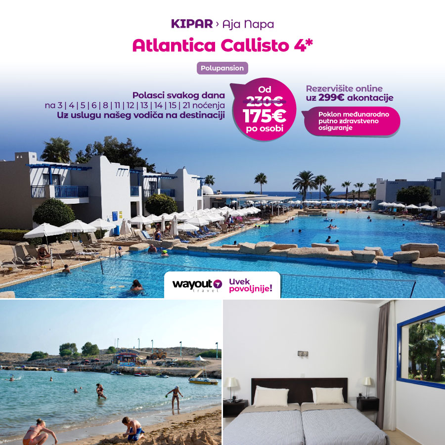 Hotel Atlantica Callisto je uređen po principu tradicionalnog mediteranskog sela sa belim dvospratnim bungalovima plavih salona, prozora i vrata. Jedna od lepših plaža u Aja Napi Vathia Gonia se nalazi odmah ispred hotela. Gostima su na raspolaganju dva velika spoljašnja bazena, bazen za decu i bebe, sauna, teretana, teniski teren, igralište za decu kao i celodnevna animacija.