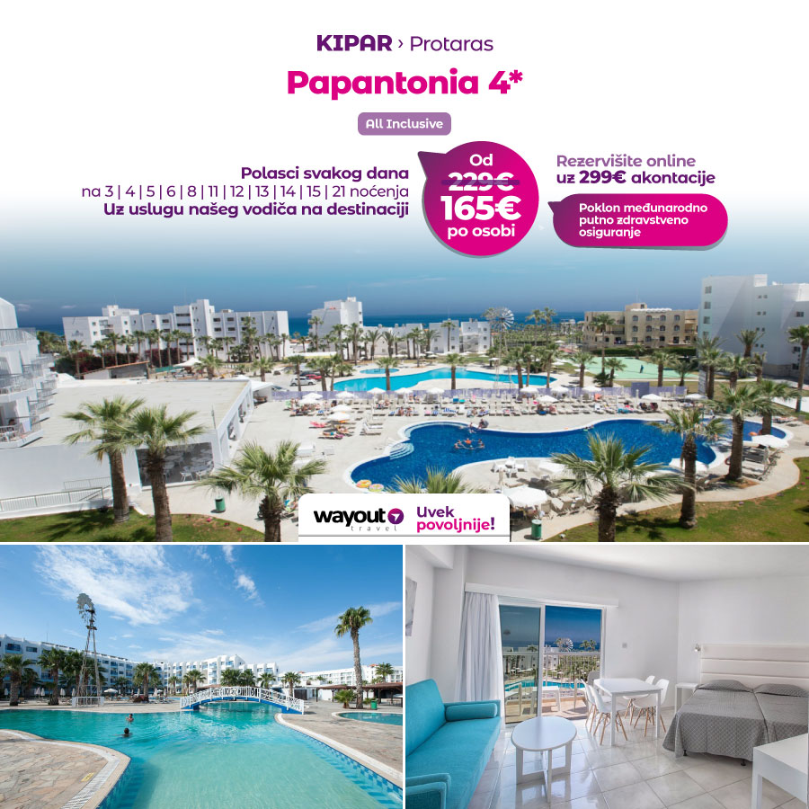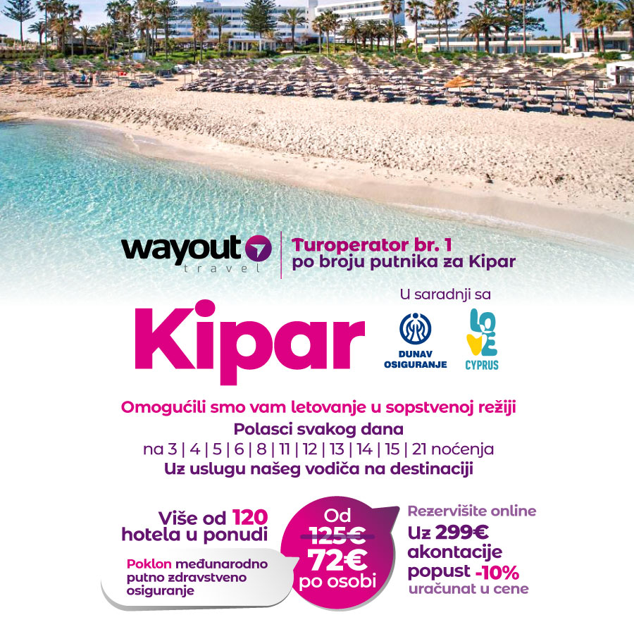 Wayout kao turoperator br.1 po broju putnika za Kipar, a u saradnji sa Ministarstvom Turizma Kipra i Dunav osiguranjem, svojim putnicima je omogućio letovanje u sopstvenoj režiji na ovom predivnom mediteranskom ostrvu – uz uslugu našeg vodiča na destinaciji, a na poklon dobijate i međunarodno putno zdravstveno osiguranje (suma osiguranja 15.000 EUR).