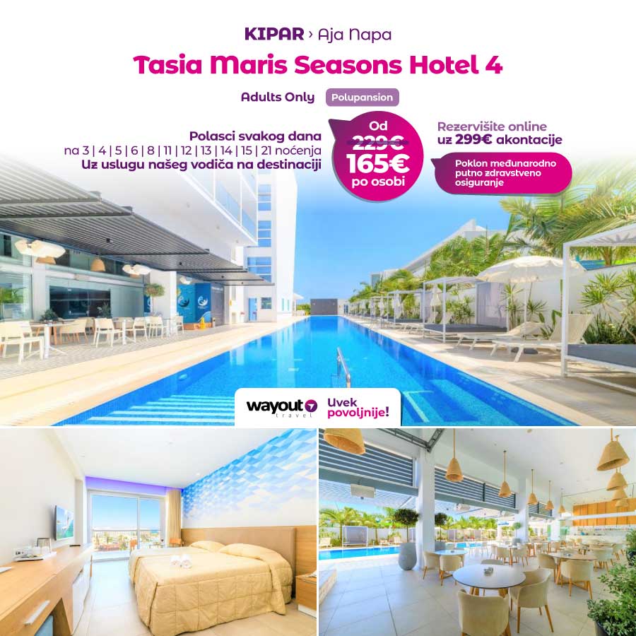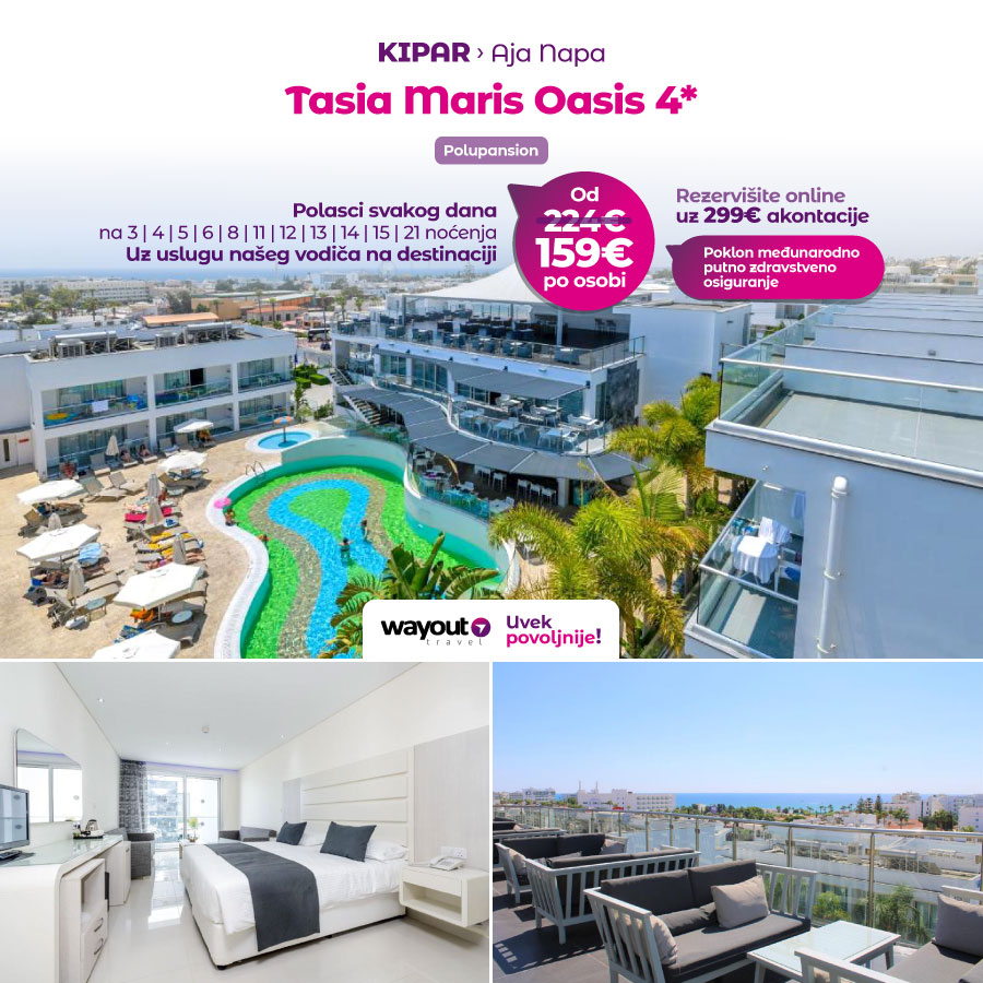 Smešten na samo 5 minuta hoda od centra Aja Nape, objekat Tasia Maris Oasis uključuje bazen slobodnog oblika, 2 restorana i 2 bara. Grčka plaža, najveća peščana plaža u Aja Napi, udaljena je samo 10 minuta hoda. Na pešačkoj udaljenosti nalaze se restorani, barovi i prodavnice. Parking u okviru objekta može se besplatno koristiti.