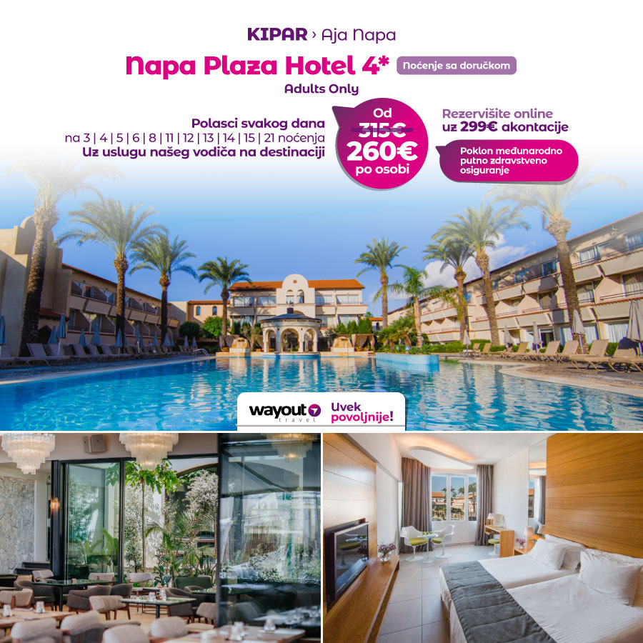 Hotel Napa Plaza nalazi se u samom centru Aja Nape. Hotel je Adults Only što znači da je namenjen isključivo odraslim gostima. Hotel je udaljen svega 7 minuta hoda od gradske plaže Pantacou i svega 1km od Grecian Bay plaže. Obzirom da se nalazi u samom centru, okružen je prodavnicama, kafićima, restoranima i poslastičarnicama. U sastavu hotela je i otvoreni bazen sa ležaljkama i suncobranima koji su besplatni za sve goste hotela.