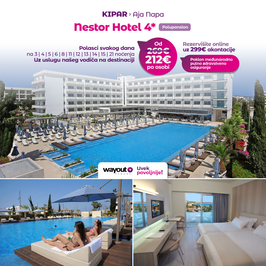 Hotel Nestor nalazi se u neposrednoj blizini centra grada. Od glavnog setalista Ayia Nape deli vas samo nekoliko minuta hoda. Plaža Limanaki se nalazi na samo 10-ak minuta hoda, a u neposrednoj blizini su Mandi plaža i Pantacu plaža. Hotelski bazen nudi gostima besplatne ležaljke i suncobrane tokom celog dana. Za najmladje goste u ponudi je dečiji bazen i dečije igralište.