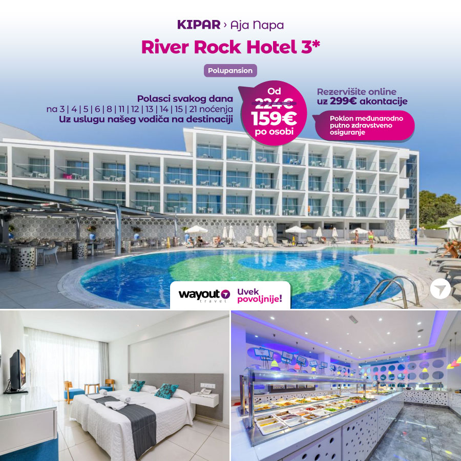 Hotel River Rock nalazi se u u mirnom delu centra Aja Nape, a od glavnih desavanja u centru deli ga samo nekoliko minuta hoda. Plaža Pantacu udaljena je samo 10-ak minuta hoda. Gosti hotela mogu uživati na hotelskom bazenu, vrtu i hotelskom baru. Za goste hotela je obezbedjen i besplatan parking.