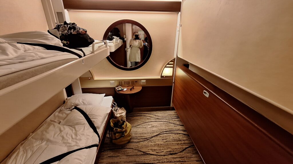 Iz lifta se izlazi u lavirint uzanih hodnika koji vode do kabina. Moram da priznam da sam očekivala nešto još gore kad sam otvorila vrata i zakoračila u sobicu u kojoj ću spavati narednih noći. Žućkasto osvetljenje je značajno popravljalo prvi utisak, delovalo je kao da je već veče i skretalo mi pažnju s činjenice da nema prozora.