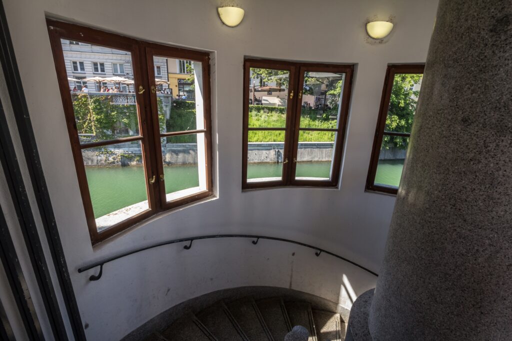 Stepenice vode iz prizemlja gradske pijace ka donjem nivou – ribarnici – i otkrivaju jedinstvene vizure kroz pažljivo dizajnirane prozore. Pogled na Ljubljanicu dok se lagano spuštate niz kamene spirale pruža osećaj smirenosti i autentične povezanosti između arhitekture i prirode.
