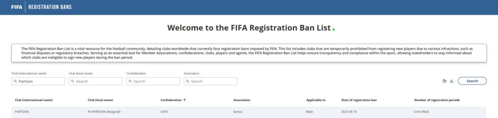 „FIFA Lista zabrane registracije je važan resurs za fudbalsku zajednicu, koja sadrži spisak klubova širom sveta koji se trenutno suočavaju sa zabranom registracije novih igrača, a koju je izrekla FIFA. Ova lista obuhvata klubove kojima je privremeno zabranjeno da registruju nove igrače zbog različitih prekršaja, kao što su finansijski sporovi ili kršenja propisa. Kao ključni alat za nacionalne saveze, konfederacije, klubove, igrače i agente, FIFA Lista zabrane registracije doprinosi transparentnosti i usklađenosti u sportu, omogućavajući svim učesnicima da budu informisani o tome koji klubovi nisu u mogućnosti da potpisuju nove igrače tokom trajanja zabrane“, stoji u opisu pomenutog sajta.