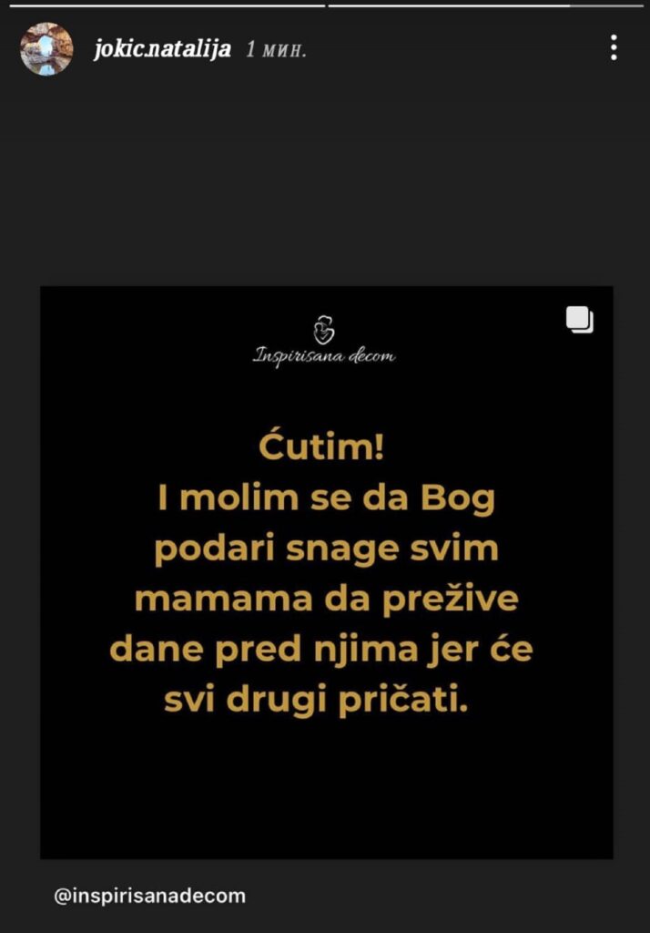 „Ćutaću za sve mame koje sada vrište jer im se srušio ceo svet. Ćutim! I molim se da Bog podari snage svim mamama da prežive dane pred njima jer će svi drugi pričati“, prenela je Natalija.