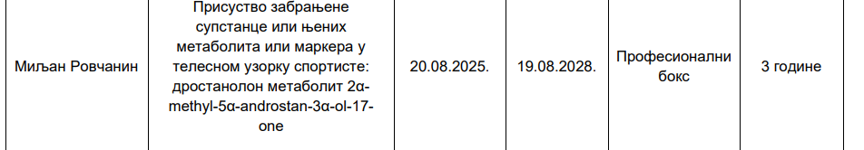 Kako je navedeno na sajtu Antidoping agencije Srbije, Rovčanin je suspendovan 20. avgusta 2025. godine, a boksu će moći da se vrati za tri godine – 19. avgusta 2028.