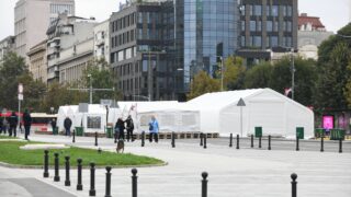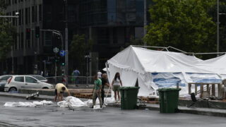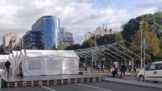 Grupa ljudi postavlja nove šatore ispred Skupštine