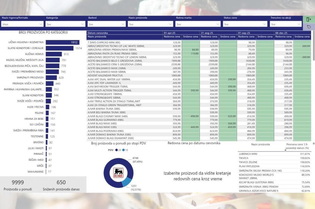 Na platformi „Cenovnici po uredbi“ od juče su javno dostupne cene proizvoda u čak 27 trgovinskih lanaca, kao i detaljan pregled cena proizvoda po datumima. Takođe je moguće pogledati i kretanje cena tokom vremena, kao i lista najvećih povećanja i smanjenja cena, saopštila je Kancelarija za IT i eUpravu.