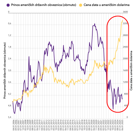 Ovo nije privremena anomalija, već promena režima: obveznice, nekada oslonac tzv. „60/40“ portfolija (60% akcije, 40% obveznice), nisu izdržale test tokom inflatornog perioda od 2021. godine. Zlato, koje ne donosi prinos, po svim pravilima bi trebalo da gubi vrednost kada rastu kamatne stope na druge investicije – ali to se nije desilo.