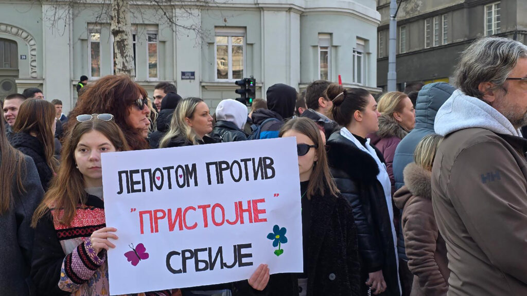 Okupljeni su stajali 15 minuta u tišini držeći transparente "Lepotom protiv pristojne Srbije", "Treća je uz studente", "Znanje nam treba, a ne vaše laži", T"BG se ne da, pravdu traži!".