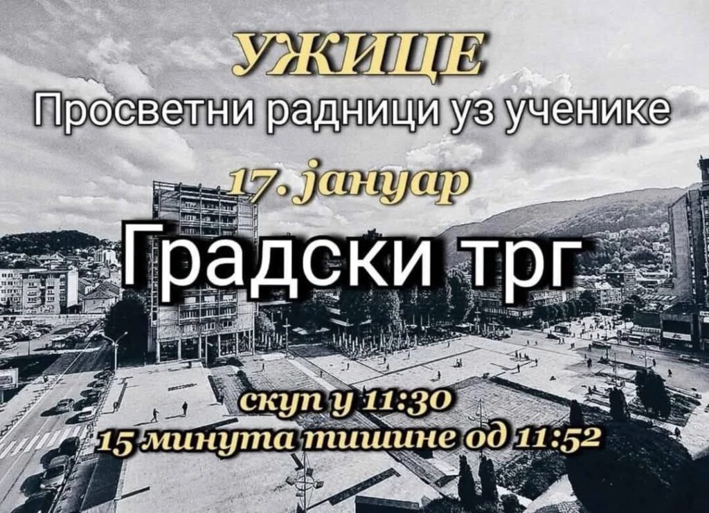 Prosvetni radnici, učenici, studenti i građani, sutra, 17.januara, okupiće se i u Užicu, na Trgu partizana u 11:30 kako bi podržali studente i sve one koji traže da institucije rade svoj posao. Dodatni motiv je pokušaj ubistva koji se danas desio u Beogradu kada je na studentkinju naleteo vozač automobilom i naneo joj teške povrede.