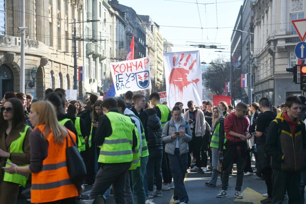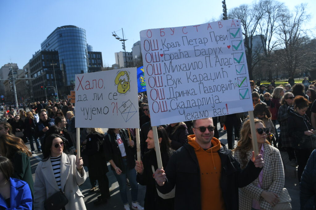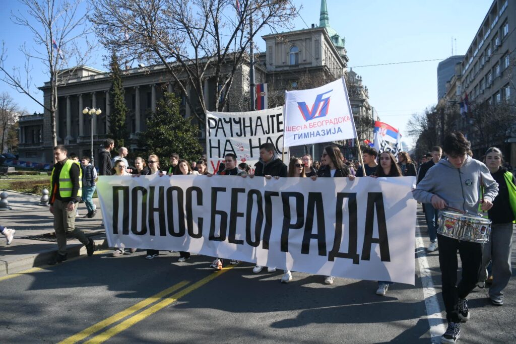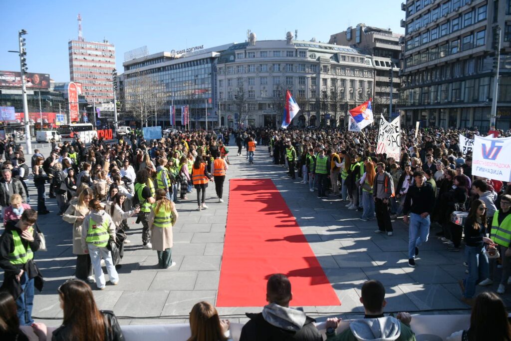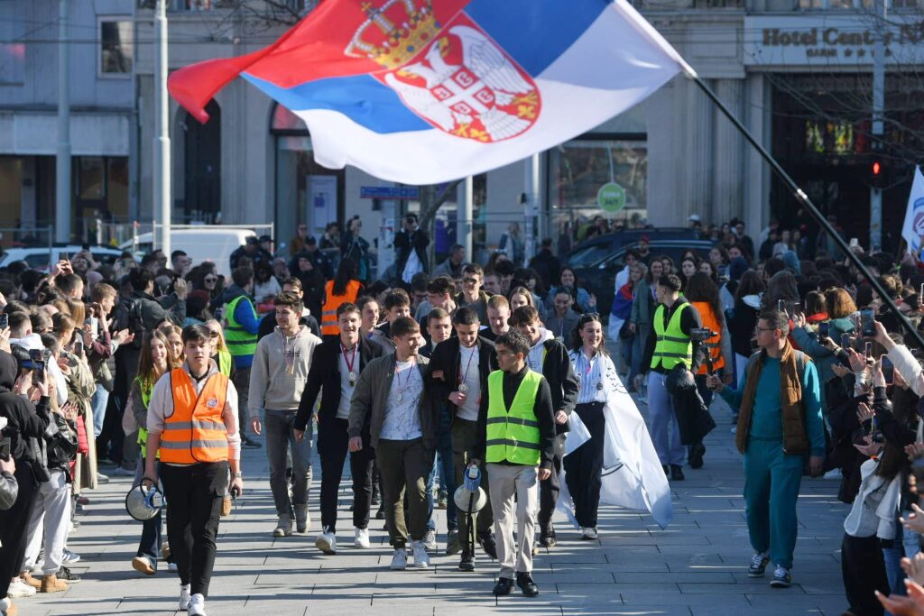 Kako javlja reporter Nova.rs, ispred Skupštine došli su đaci Šeste beogradske gimnazije i prosvetni radnici, dok su studenti tehničkih fakulteta sa srednjoškolcima sada u Ulici kralja Milana i kreću se ka Terazijama.