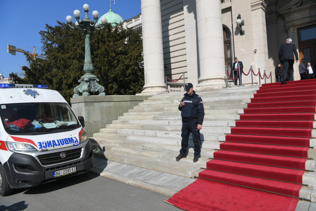 Sa druge strane, ispred glavnog ulaza, nema mnogo policije, svega nekoliko njih u uniformi. Nešto ranije, stiglo je jedno vozilo hitne pomoći.