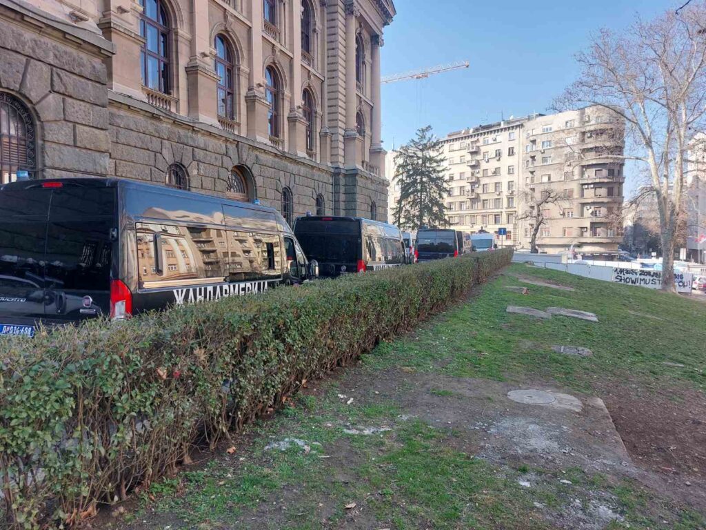 U blizini tog ulaza, iza zgrade parlamenta prisutan je veliki broj policijskih vozila, uglavnom marica i džipova. Naš reporter kaže da ih ima najmanje 15.