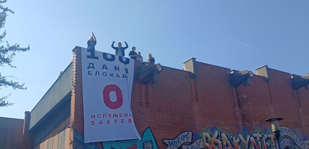 Studeti Fakulteta dramskih umetnosti razvili su baner na zgradi "100 dana blokade, 0 ispunjenih zahteva", čije je postavljene ispraćeni aplauzom.