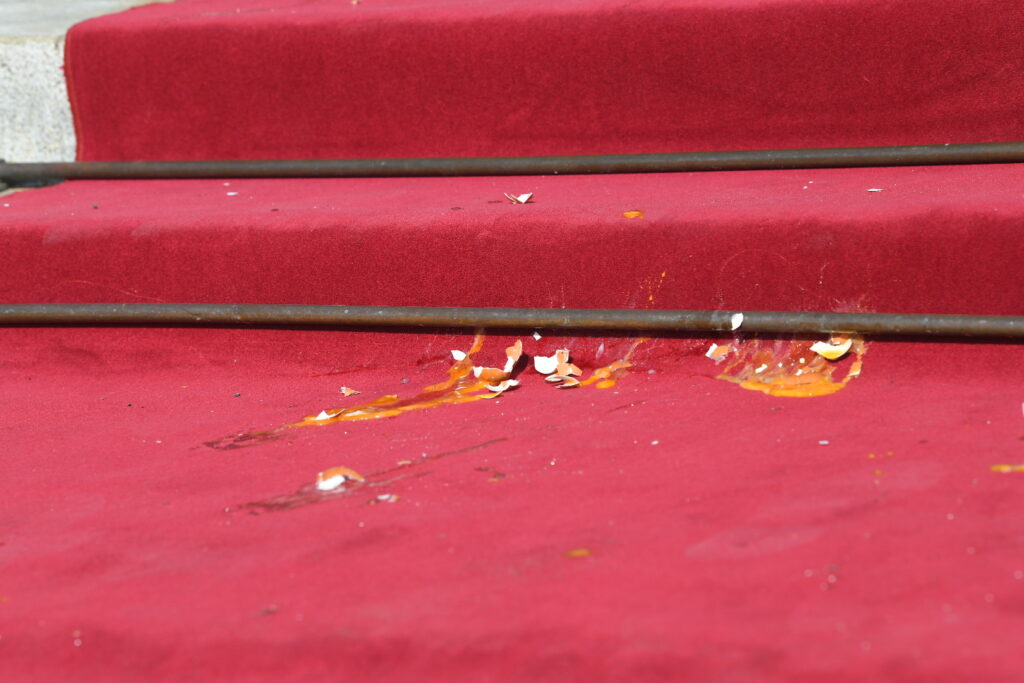 Okupljeni građani gađali su jajima zgradu Skupštine Srbije.