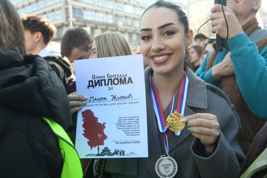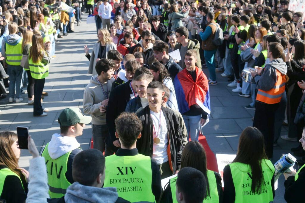 "Vaš korak ka Nišu nije samo fizički napor već korak ka boljem sutra. To je poruka da nećemo stati, borićemo se sve dok ne budemo živeli u društvu gde se ceni znanje i poštuju zakoni. Ponosni smo na vas, ponosni što smo deo generacije koja se bori za bolji život", poručeno je na Trgu republike na svečanom dočeku beogradskih srednjoškolaca koji su pešačili do Niša.