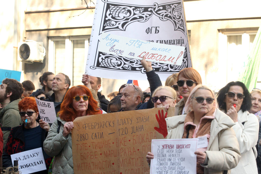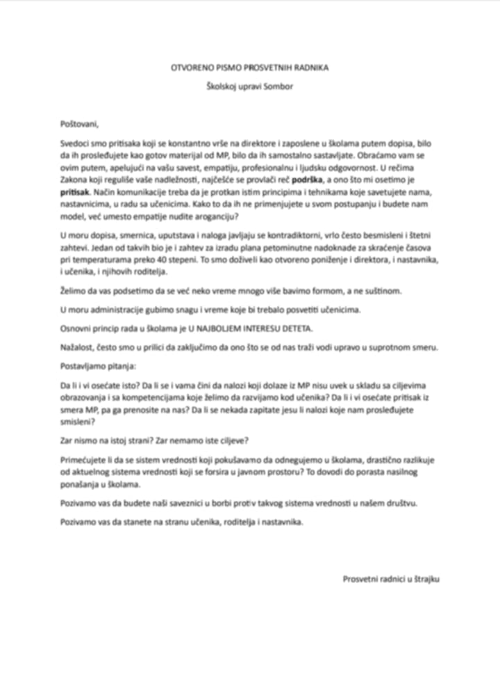 Na protestnom skupu prosvetnih radnika, ispred školske uprave u Somboru, pročitano je otvoreno pismo toj instituciji u kom se zaposleni žale na pritisak koji na njih vrše pojedini direktori.