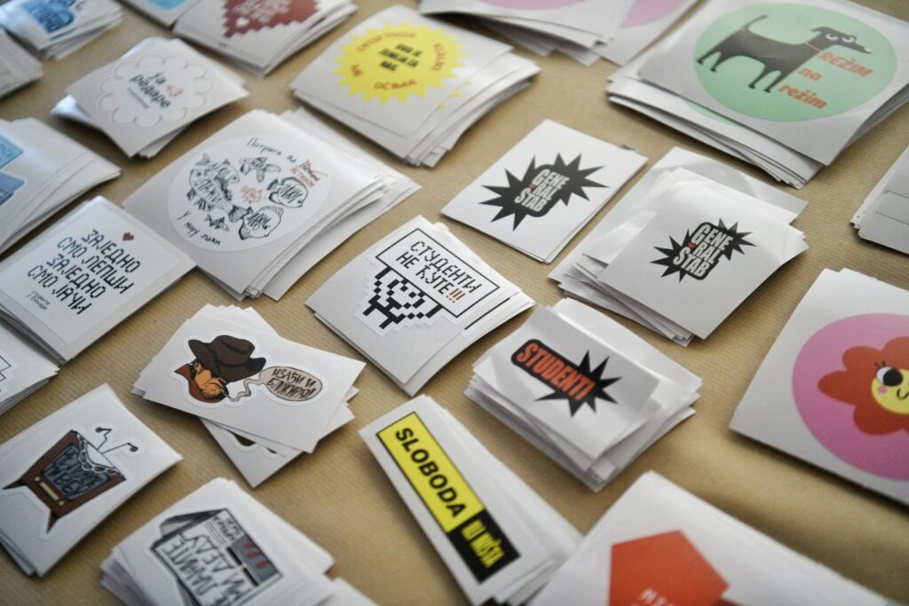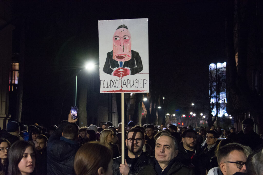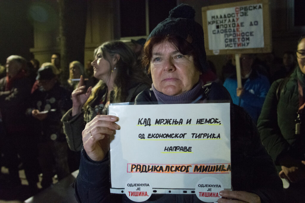 Ispred dopisništva RTS vijorile su se zastave Srbije, a građani su nosili i nalepnice na kojima piše: “Odjeknula je tišina” – rečenica iz priloga Lidije Georgijeve zbog koje ju je Vučić nazvao “imbecilom”.