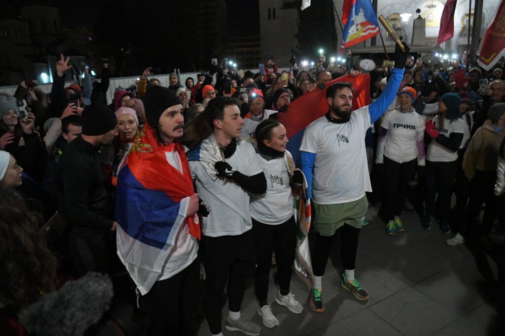 Kragujevački studenti, koji su jutros krenuli u štafetni maraton, trče ulicama Beograda do Hram Svetog Save gde im se priprema doček.