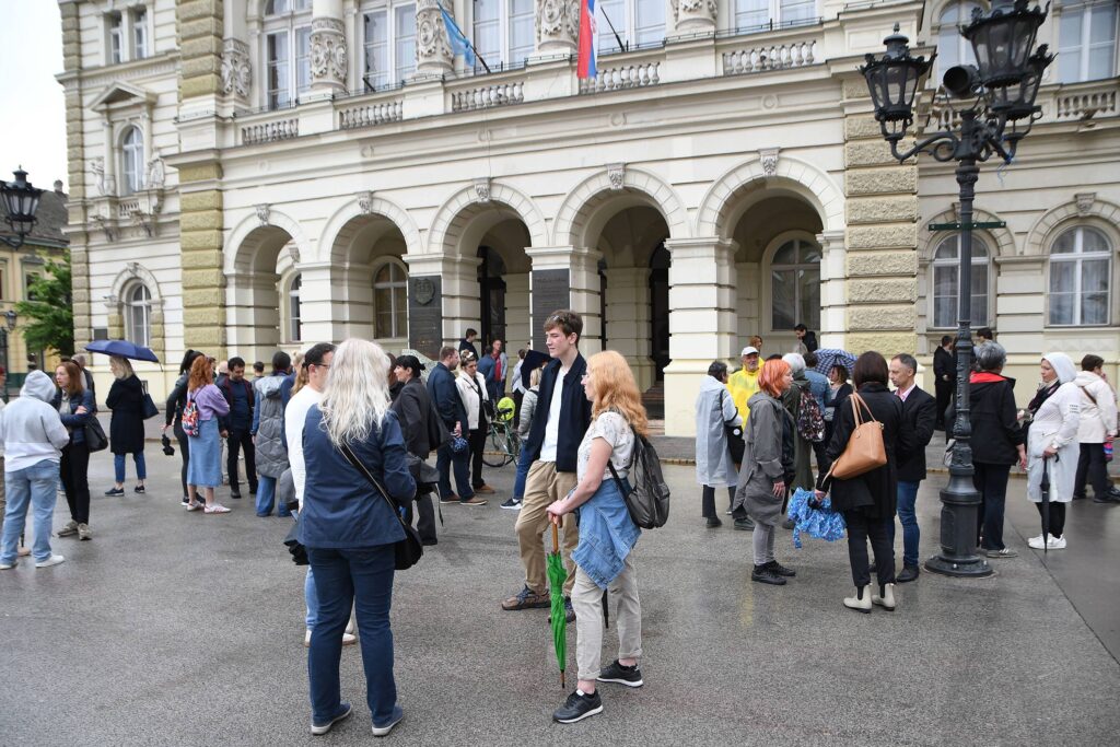 Profesori, djaci i roditelji učenika Jovine gimnazije ispred Gradske kuće čekaju kolege koji su ušli na razgovor sa gradonačelnikom Novog Sada.