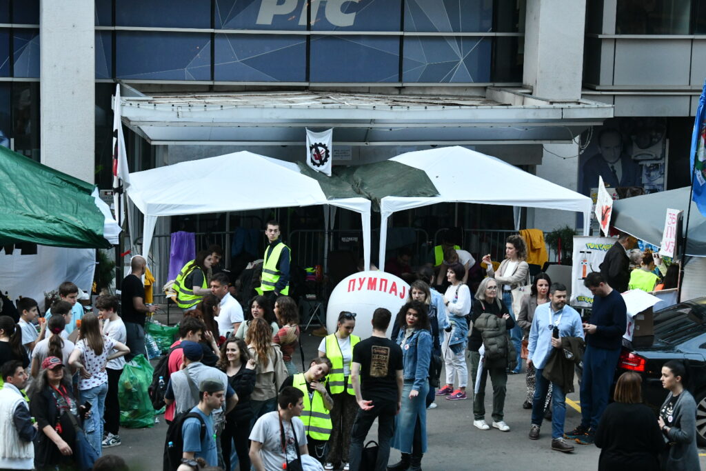 U Takovskoj ulici ispred zgrade Radio-televizije Srbije (RTS), koju studenti blokiraju od 14. aprila, okupili su se građani koji su se priključili akciji odavanja pošte.