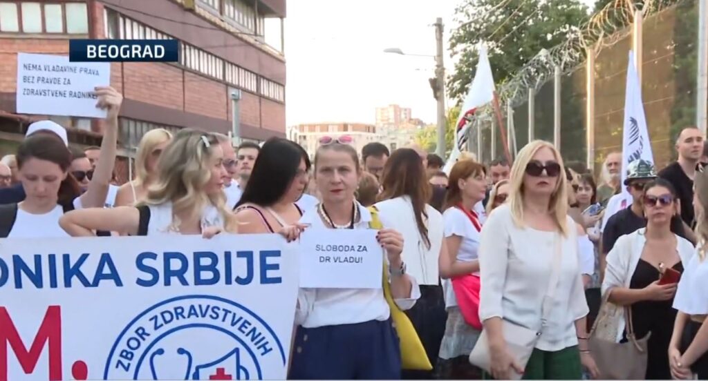 "Zdrav sistem, zdravi ljudi" i "Sloboda za dr Vladu", piše na nekim transparentima.