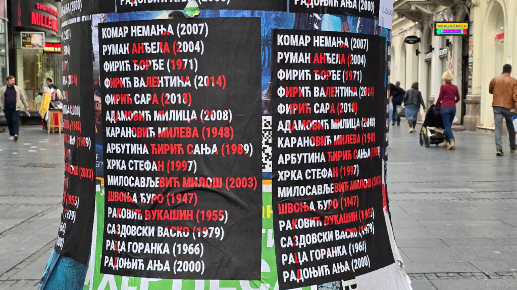 U centru Beograda danas su oblepljeni plakati crne boje na kojima je grafički prikaz krvave šake preko koje su napisana imena 15 žrtrva pada betonske nadstrešnice.
